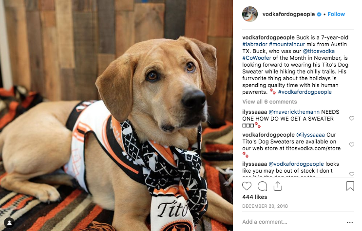 In addition to their Titos Instagram, this brand also runs Vodka for Dog People – sending a brand statement of ending homelessness for pets to more than 26.2k followers. This profile taps into our love of dogs and engages customers to be influencers.