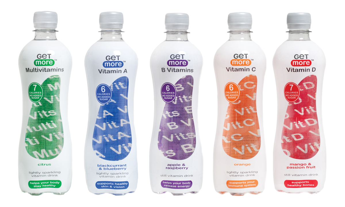 However the slender curvaceous bottle sleeved in white with primary colour codes doesn’t feel very ‘watery’. The window itself reminds me of a stomach or maybe a kidney, hence highly functional, yet the typography and name ‘Get more’ don’t quite add up to a convincing pharmaceutical story.