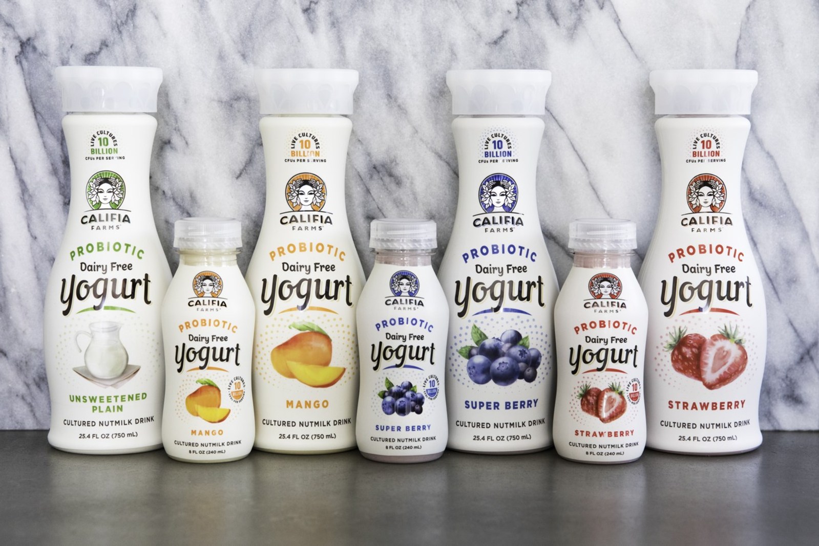Available in both multi-serve and single-serve, the Yogurt Drinks are available in four dairy-free varieties – Strawberry, Super Berry, Mango and Unsweetened Plain – which are all delicious, creamy, lower in sugar and flavored from real fruit. Through the launch of their Yogurt Drinks, Califia Farms is set to disrupt a new category and build upon the skyrocketing success that the brand has achieved with nut milks and coffee.