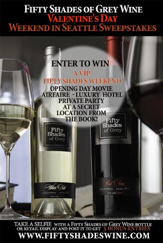 To enhance the palpable excitement for fans nationwide, Fifty Shades of Grey Wine will promote the sweepstakes through Facebook (www.facebook.com/fiftyshadeswine), where fans can enter to win a trip for two to Seattle, including a two-night stay at the luxury boutique Andra Hotel, which will be stocked with Fifty Shades of Grey premium merchandise, as well as airfare courtesy of CheapOair. As an added incentive, contestants will triple their chances to win when taking an in-store selfie with the seductive Fifty Shades of Grey Wine bottles, and posting their photos to www.facebook.com/fiftyshadeswine along with the hashtag #FiftyShadesWine.