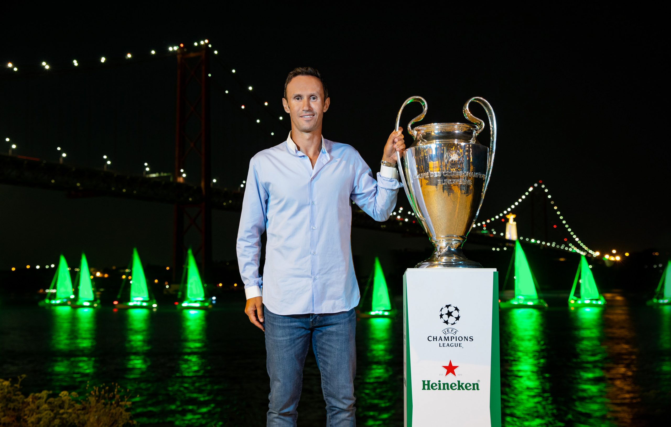 UEFA ambassador and former UEFA Champions League winner Ricardo Carvalho stands beside the trophy on the banks of the Rio Tejo, as Heineken ‘paints’ Lisbon green to celebrate the tournament’s return.