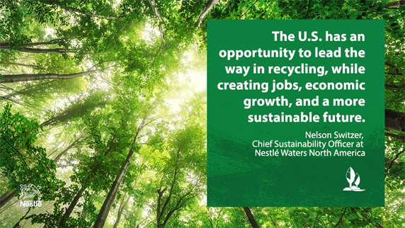 “The United States has one of the lowest recycling rates of any industrialized country, but it doesn’t have to stay that way. The U.S. has an opportunity to lead the way in recycling, while creating jobs, economic growth, and a more sustainable future,” says Nelson Switzer, Chief Sustainability Officer at Nestlé Waters North America. “As a company, we are on a very deliberate journey toward zero landfill waste in our products and operations, so I can think of no better opportunity than working collectively to ensure these recyclable materials are transformed from garbage to the valuable resources that they are.”