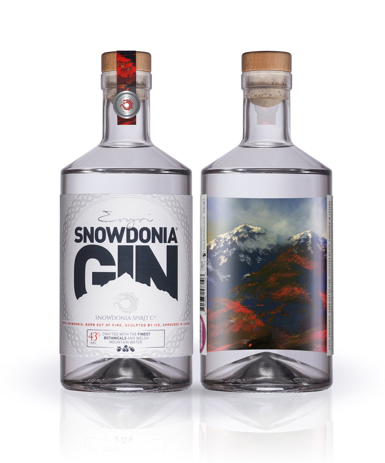 The reverse label, seen through the bottle contents, is a vivid painting of Snowdon itself by prominent UK landscape artist Alan Rankle. Working in collaboration with the Snowdonia Spirit Company, the artist was asked to represent the spirit of the Welsh Mountains, encapsulated by the brand’s strapline: ‘Eryri Snowdonia, Born out of Fire…Sculpted by Ice…Shrouded in Legend’.