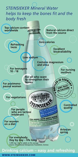 Made in Germany fully applies to Steinsieker as it is exclusively bottled in Steinsiek/Germany. The German Mineral and Table Water Regulation (MTVO) requires that a natural mineral water such as Steinsieker must be bottled directly at source into the bottles for the end consumer without any chemical treatment. Steinsieker as the Calcium champion is recommended by doctors in Germany and is one element in the therapy of osteoporosis in renowned German hospitals. Osteoporosis or bone loss is a major health issue worldwide and strongly increasing in the Middle East.
