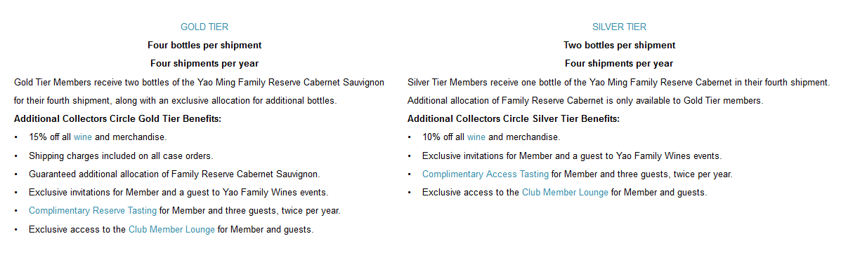 The Yao Family Wines Collectors Circle Gold and Silver memberships provide access to the limited Yao Ming Family Reserve Cabernet Sauvignon, available only on allocation, and an array of additional membership benefits.