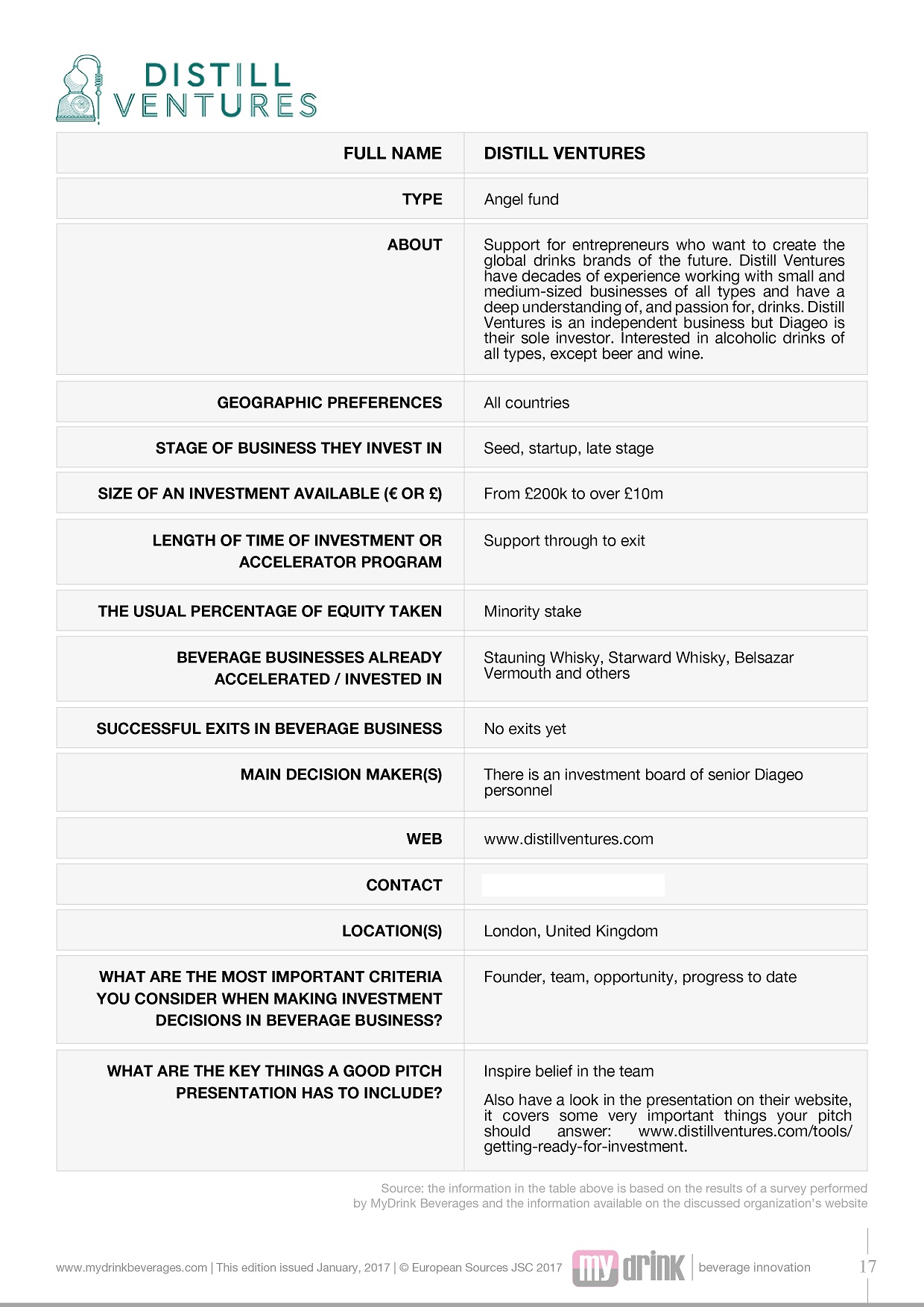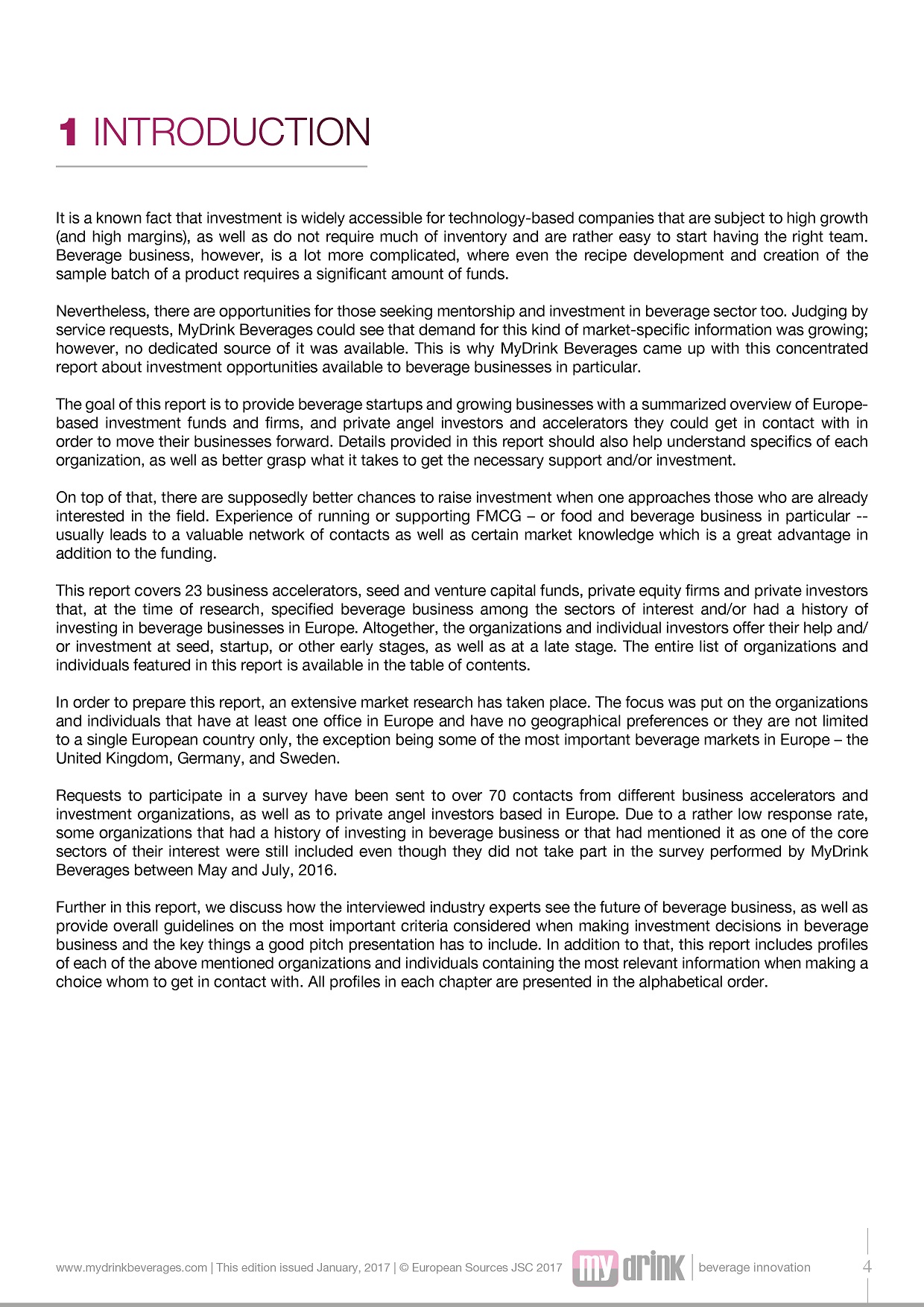 • 23 profiles of top Europe-based investors and accelerators interested in the beverage business. Profiles include key details about each organization (geographical preferences, stage of business they are interested in, funds available, equity taken, etc.), the most important criteria they consider when making investment decisions, as well as the names of some of the products they have already invested in.