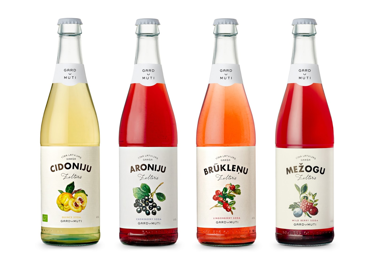 In Gardu Muti’s line of natural lemonade sodas with juice, all products—rhubarb, lingonberry, and quince, all local fruits farmed in Latvia—are Bio certified and come in 330-mL glass bottles with screw tops. The natural sodas are sweetened with sugar—also Bio certified—and have no acidity regulators such as citric or ascorbic acid. Without any colorants either, the beverage all bear shades that come naturally from their juices.